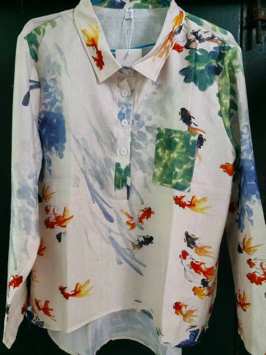 Blouse “Sylviane” – Chemise Longue Imprimée Forêt & Animaux, Coupe Ample, Printemps Été 2025