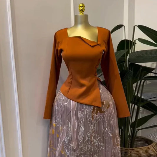 Blouse Élégante à Col Asymétrique – Boutons Côté & Manches Longues